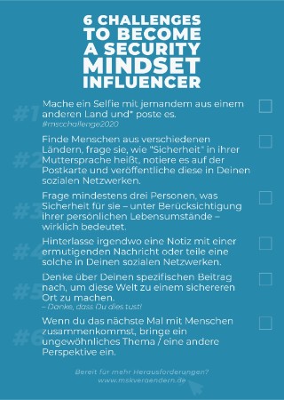 - Finde Menschen aus verschiedenen Ländern, frage sie, wie "Sicherheit" in ihrer Muttersprache heißt, notiere es auf der Postkarte und* veröffentliche diese in Deinen sozialen Netzwerken.